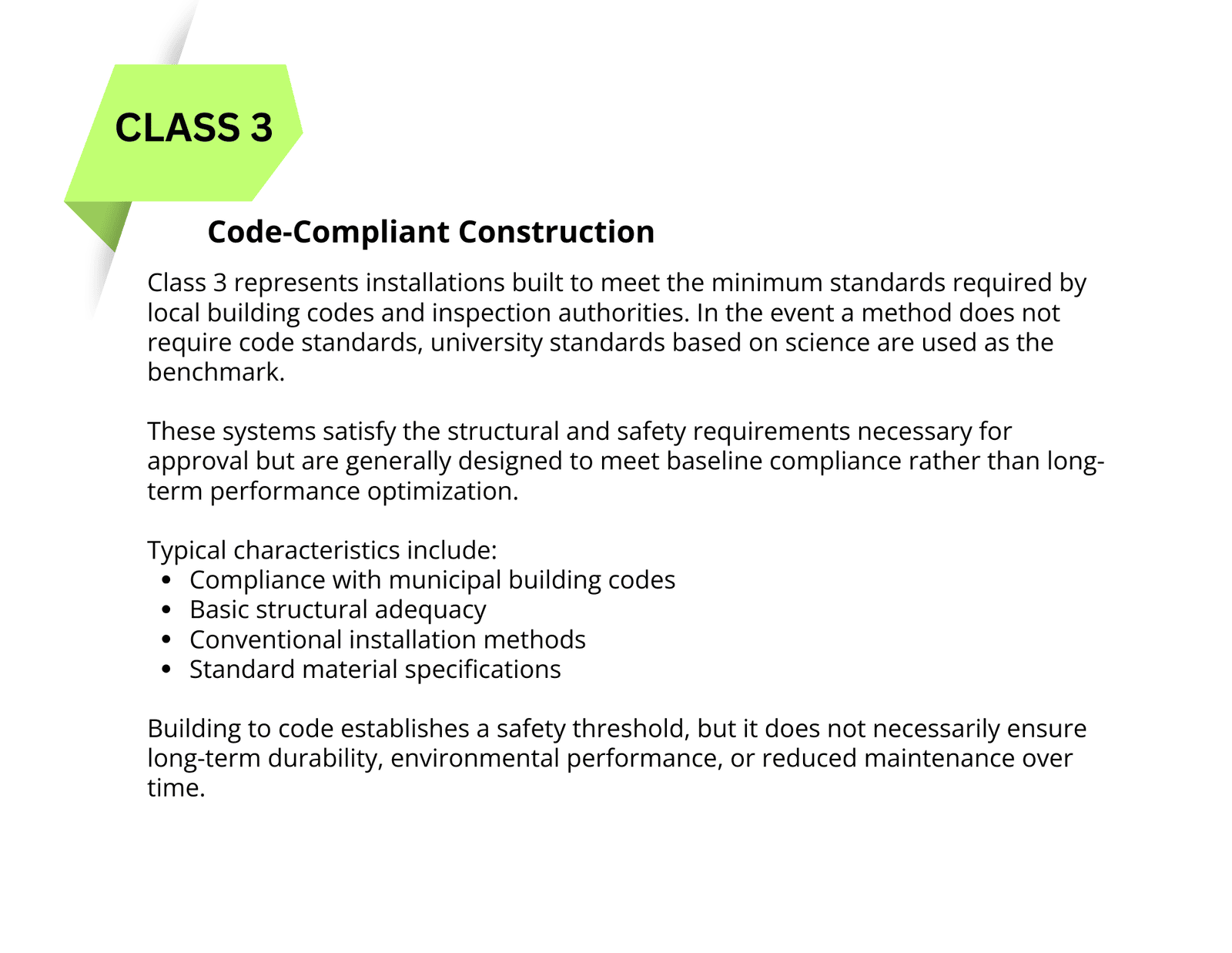 Class 2 construction improves upon baseline standards using professional engineering and upgraded materials.